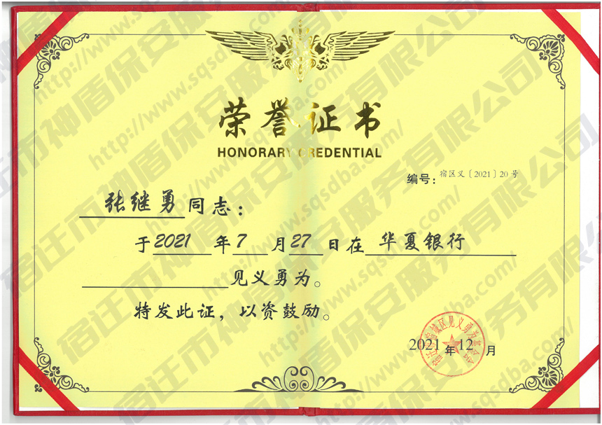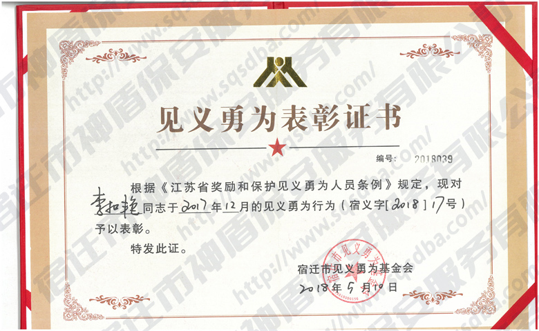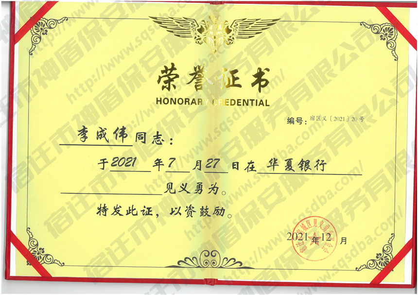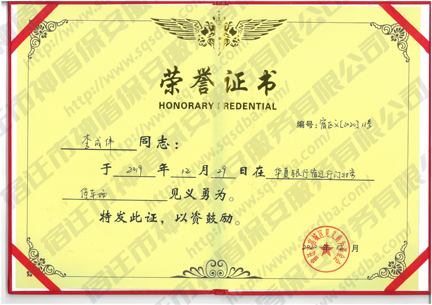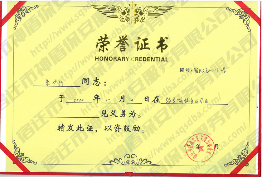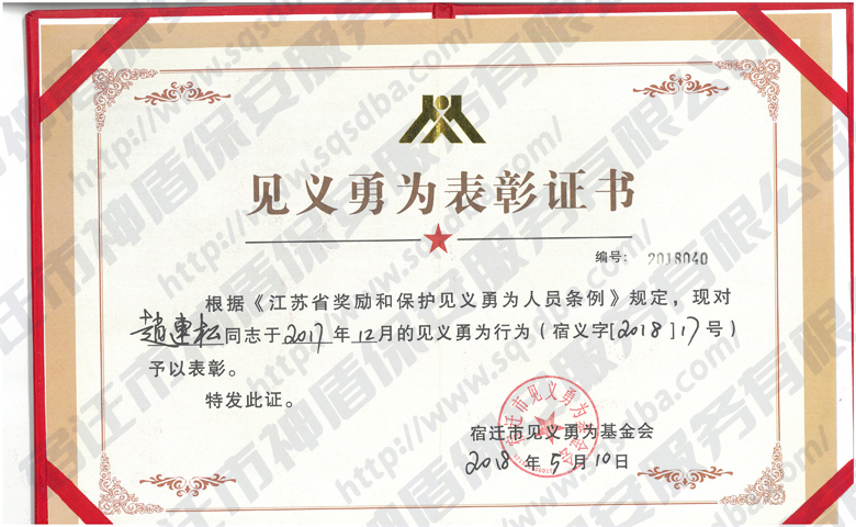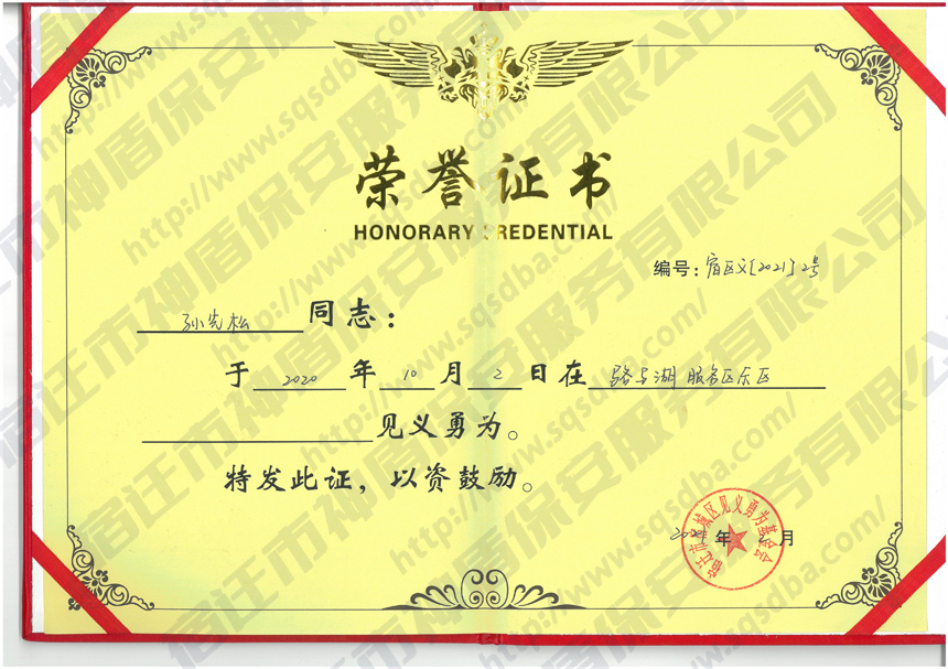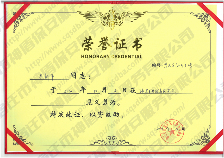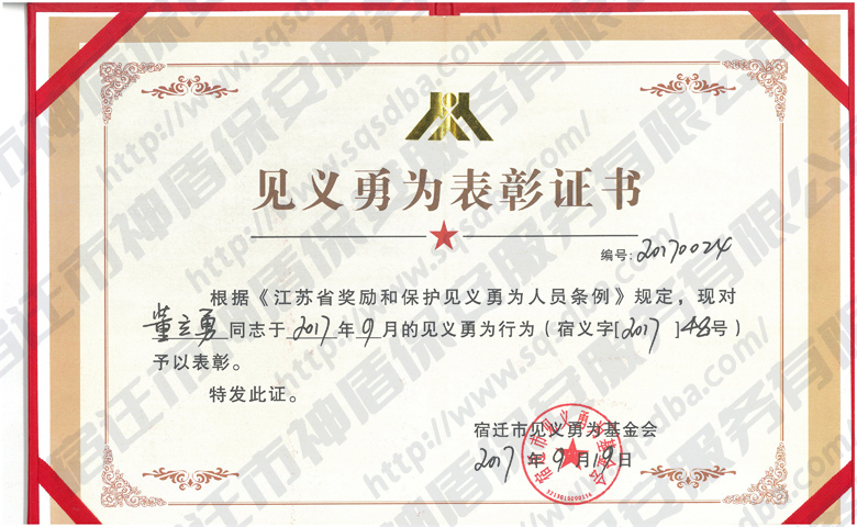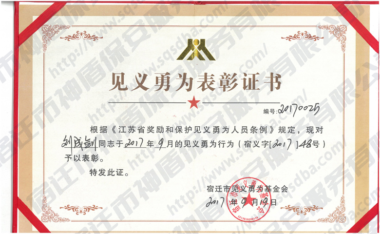 保安員見義勇為獲獎證書